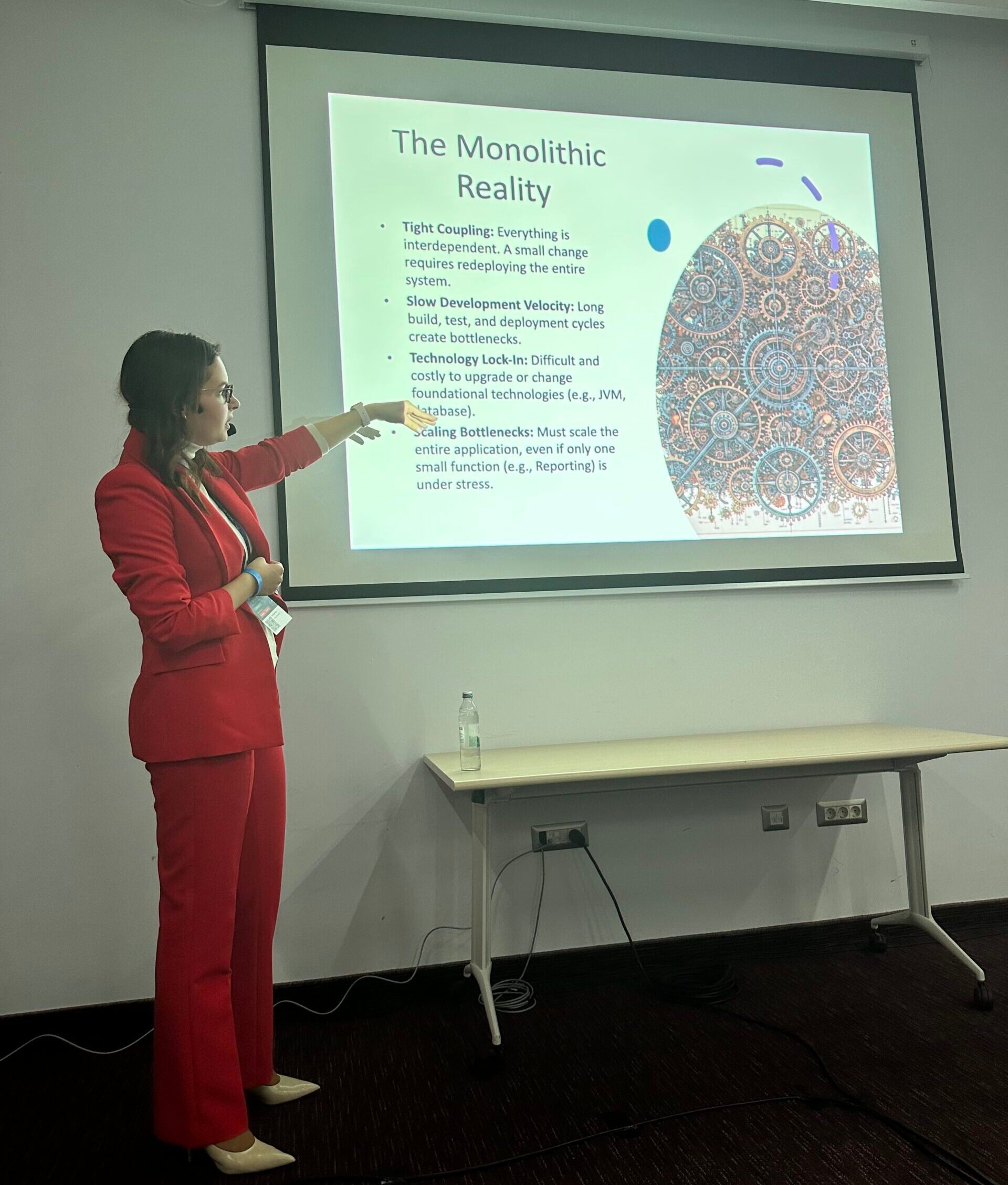Using a practical example of an e-commerce platform, she explained how microservices, such as a product catalog, shopping cart, and payment gateway, can operate as independent yet connected units – ultimately providing better adaptation to business needs and resilience to market changes.